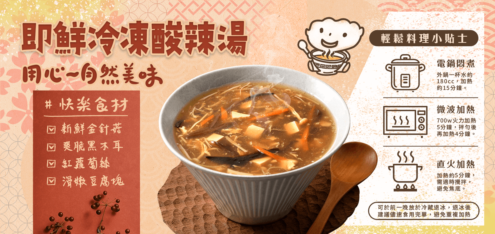臺式酸辣湯,是店內人氣湯品,也是吃餃子搭配首選的開胃暖湯,豐富的用料,包含黑木耳、金針菇、紅蘿蔔絲與滑嫩豆腐塊,不論想要搭配料理作為湯品,抑或煮一份餃子或麵,作為湯餃或湯麵都是廚房好幫手。